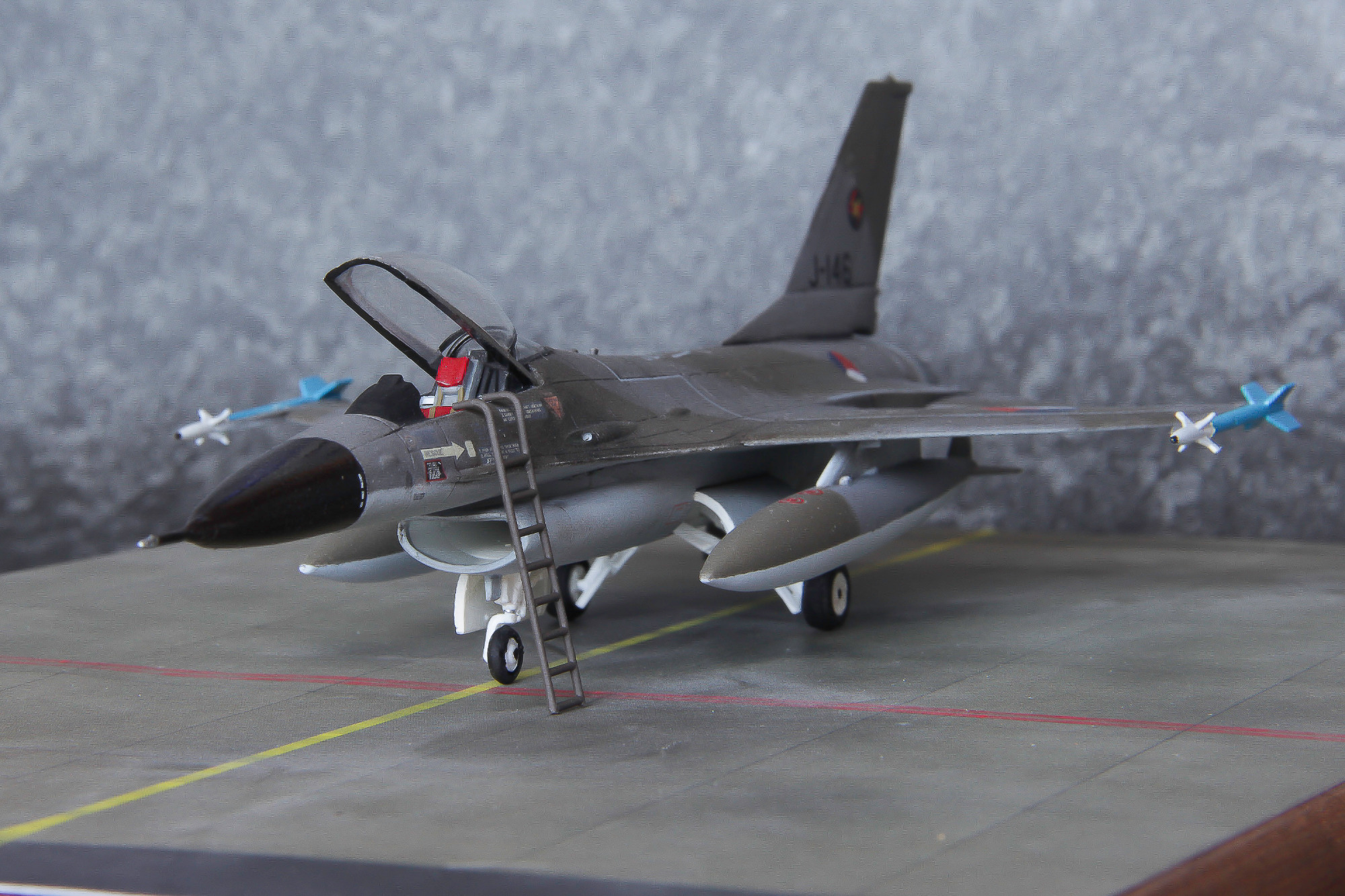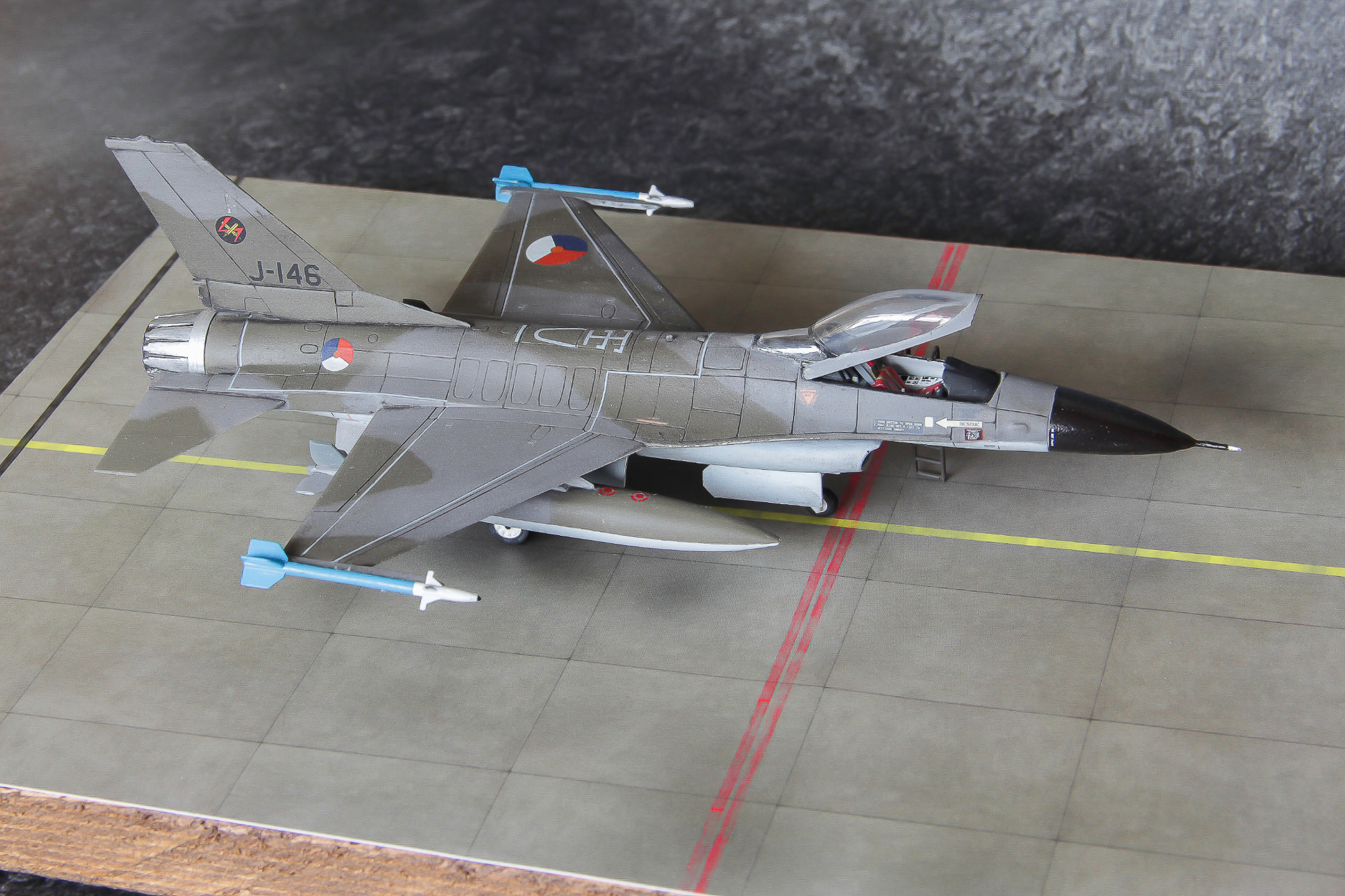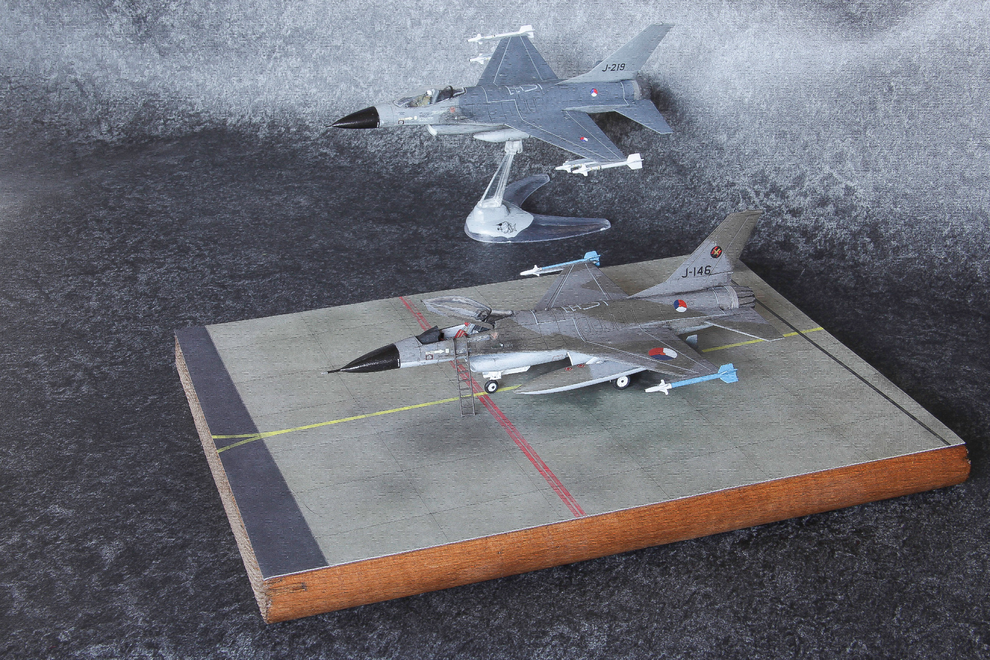 Twee ouwe 1:72 dozen simultaan gebouwd. De J-146 uitgevoerd in het jasje waarin men aanvankelijk de Nederlandse F-16's dacht te gaan spuiten, en de J-219 in de configuratie zoals ik 'm ooit tijdens een spottersdag op Leeuwarden kiekte.