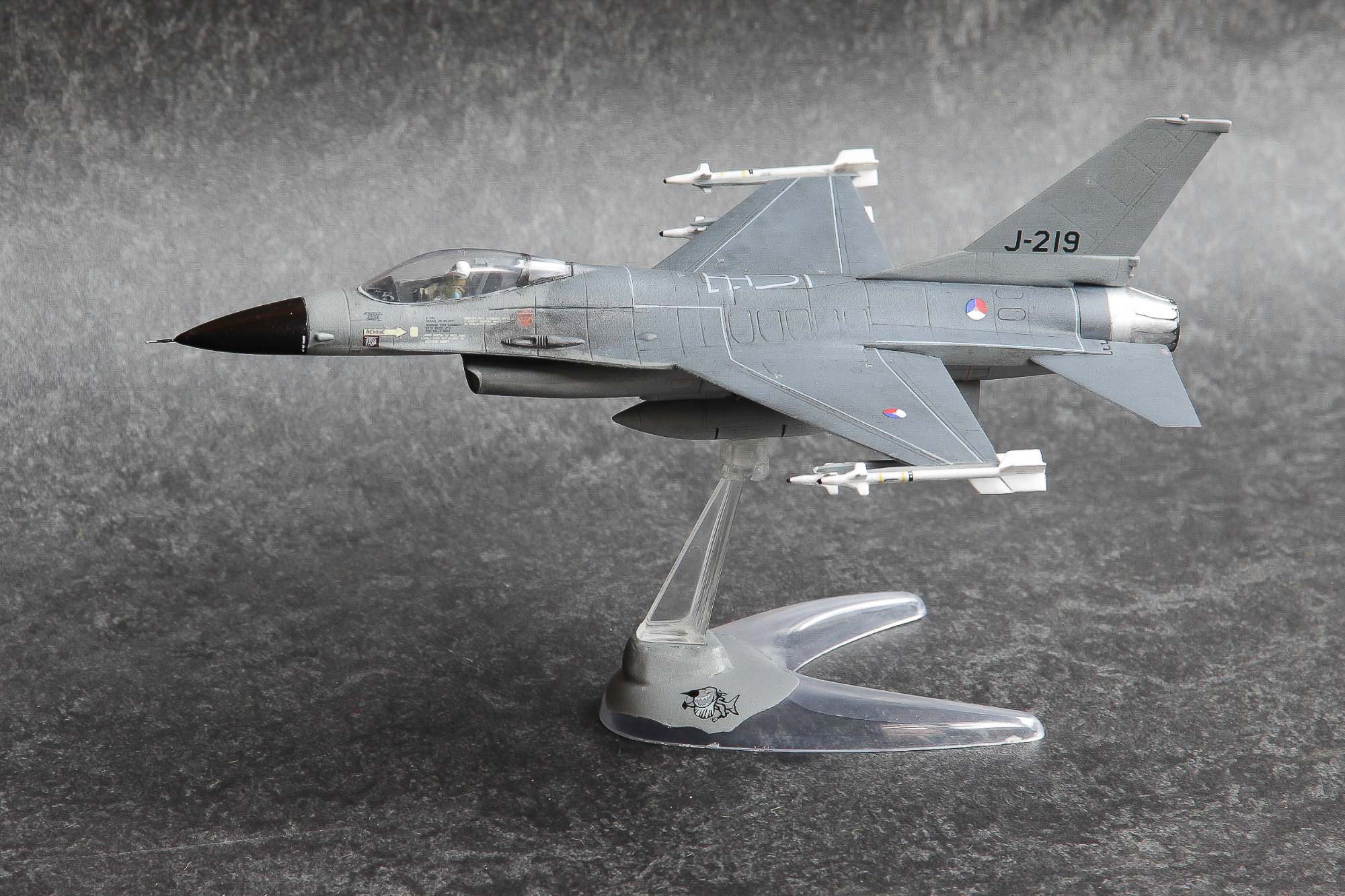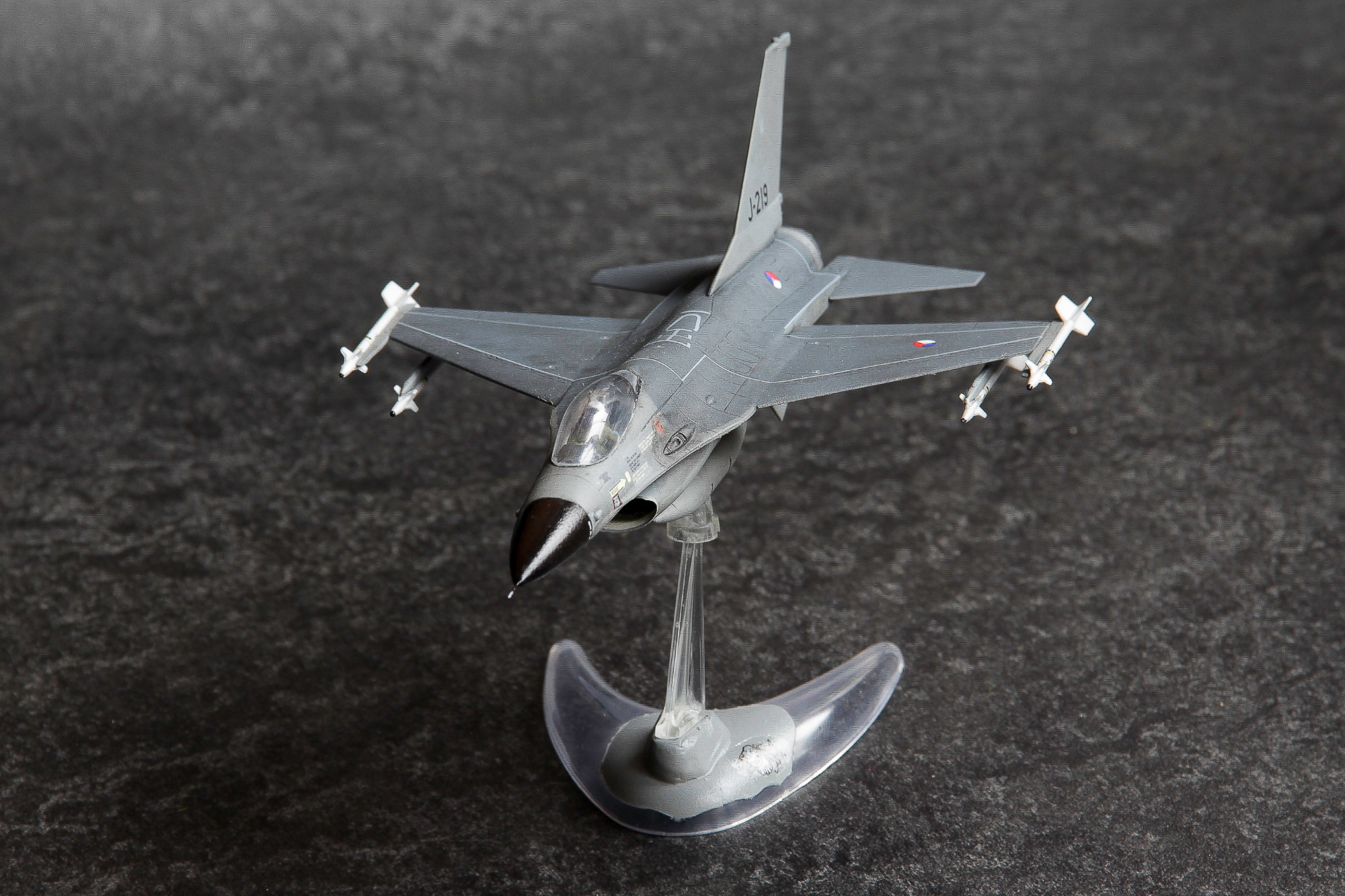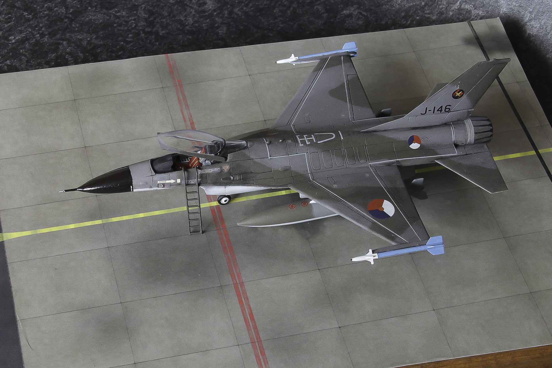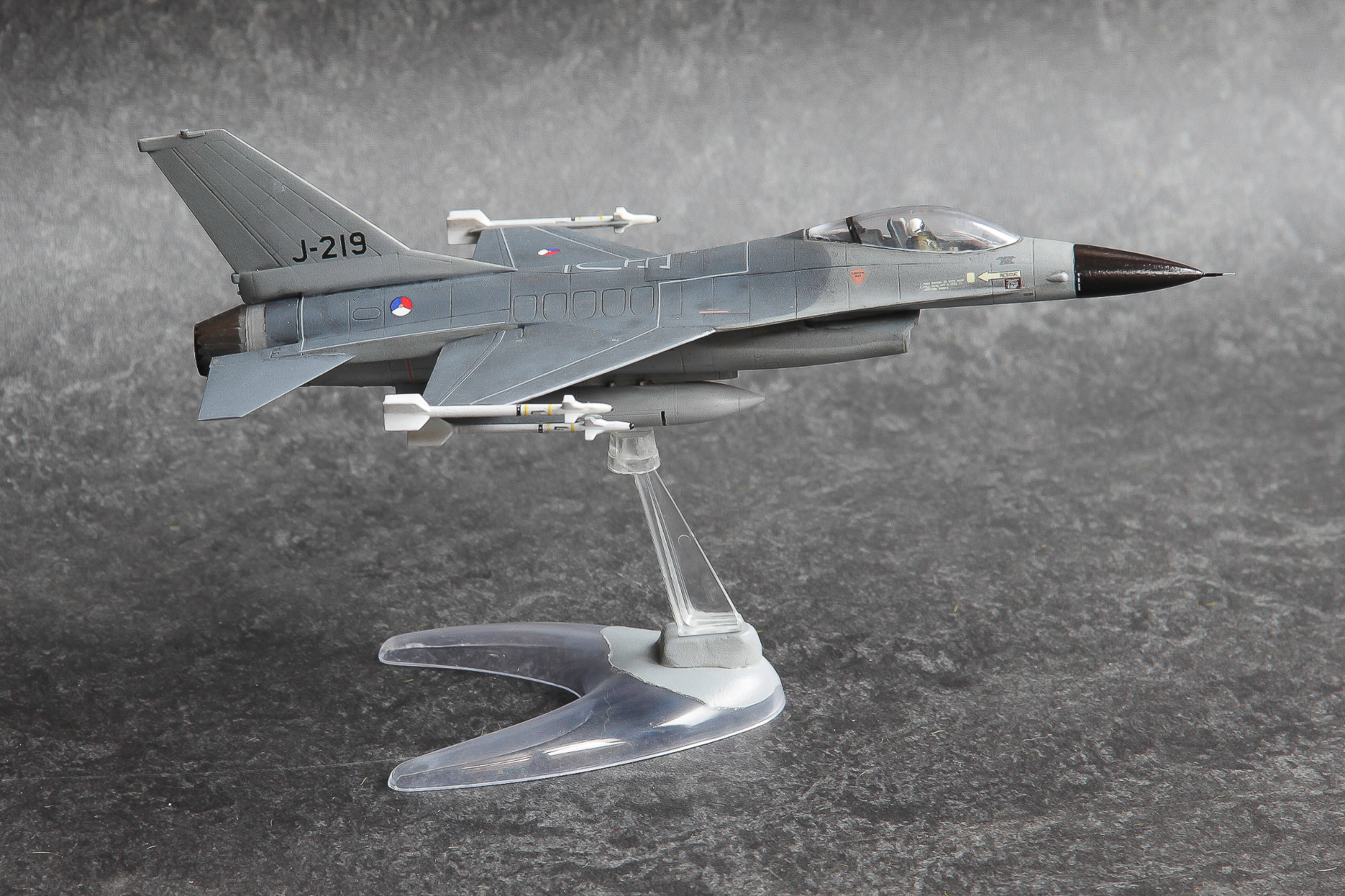 Twee ouwe 1:72 dozen simultaan gebouwd. De J-146 uitgevoerd in het jasje waarin men aanvankelijk de Nederlandse F-16's dacht te gaan spuiten, en de J-219 in de configuratie zoals ik 'm ooit tijdens een spottersdag op Leeuwarden kiekte.